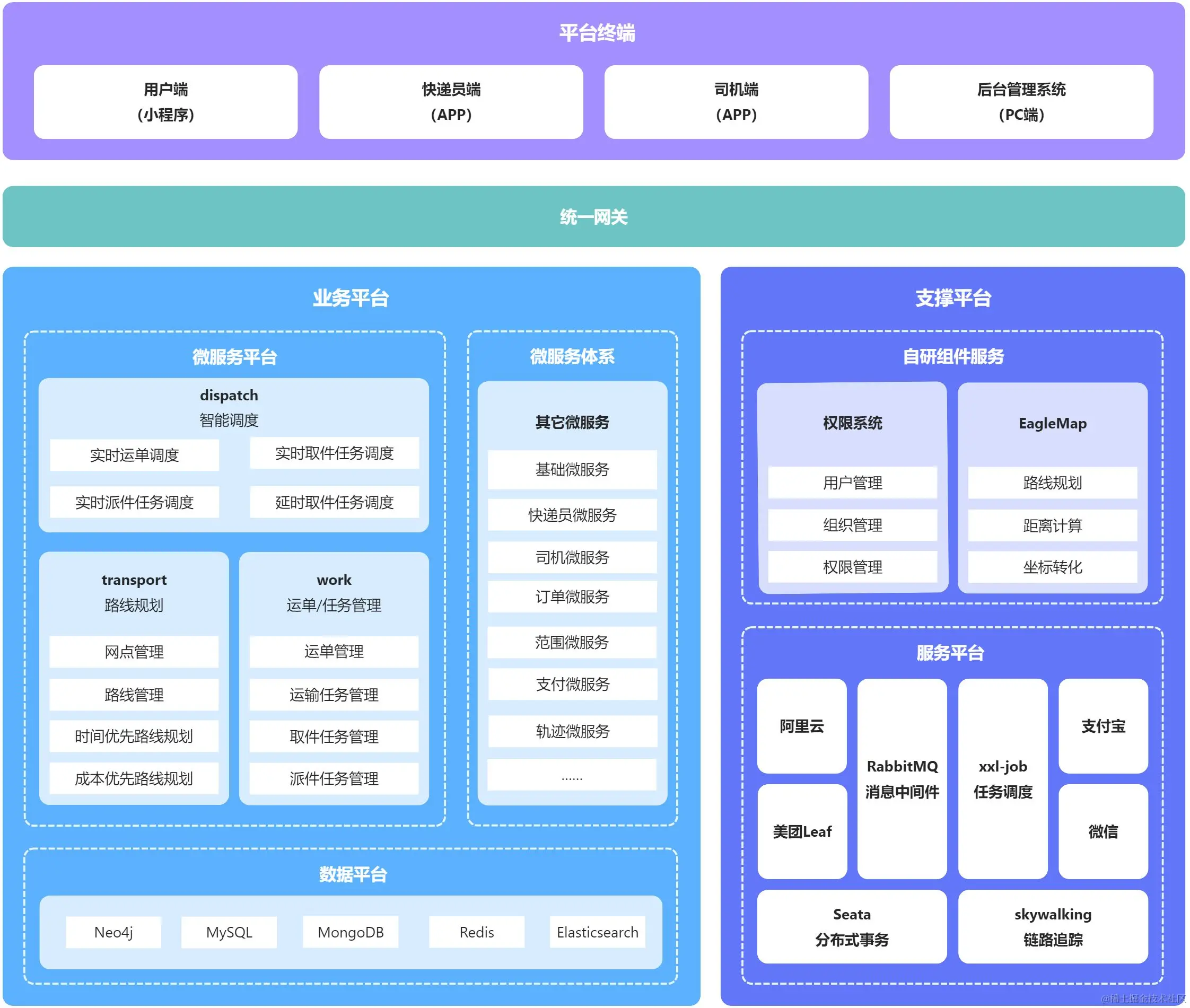 从广度上来说,物流系统可以理解为由多个子系统组成,这里我们以一般综合型物流系统举例,在整体框架上可以分为仓储系统WMS、运配系统TMS、单据系统OMS和计费系统BMS。
