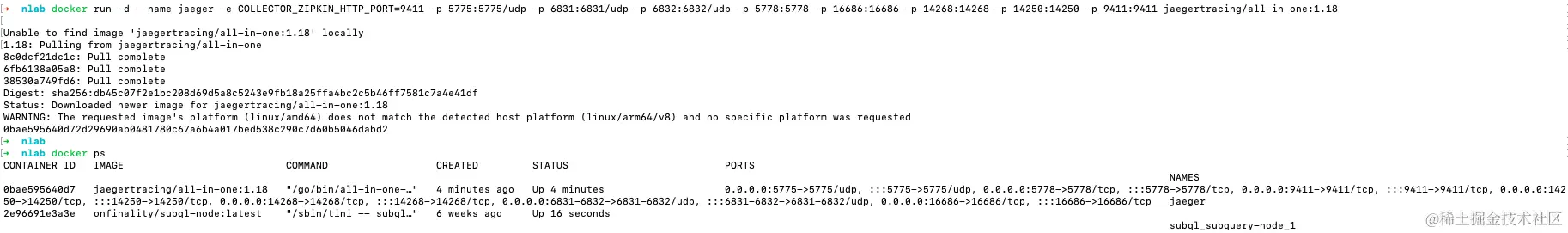 docker run -d --name jaeger -e COLLECTOR_ZIPKIN_HTTP_PORT=9411 -p 5775:5775/udp -p 6831:6831/udp -p 6832:6832/udp -p 5778:5778 -p 16686:16686 -p 14268:14268 -p 14250:14250 -p 9411:9411 jaegertracing/all-in-one:1.18