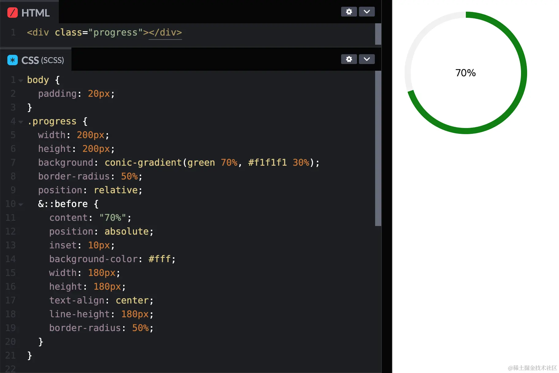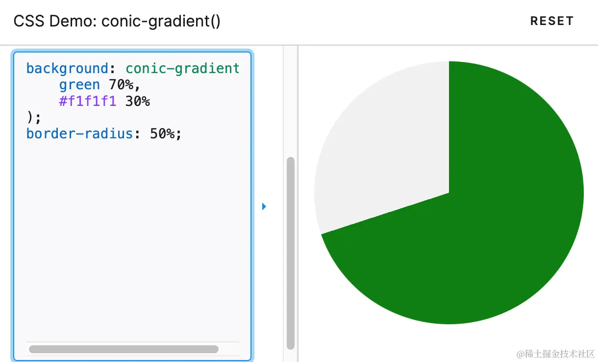 其实有更简单的办法,今天我们使用纯css实现一个环形进度条,那就是使用css函数conic-gradient():