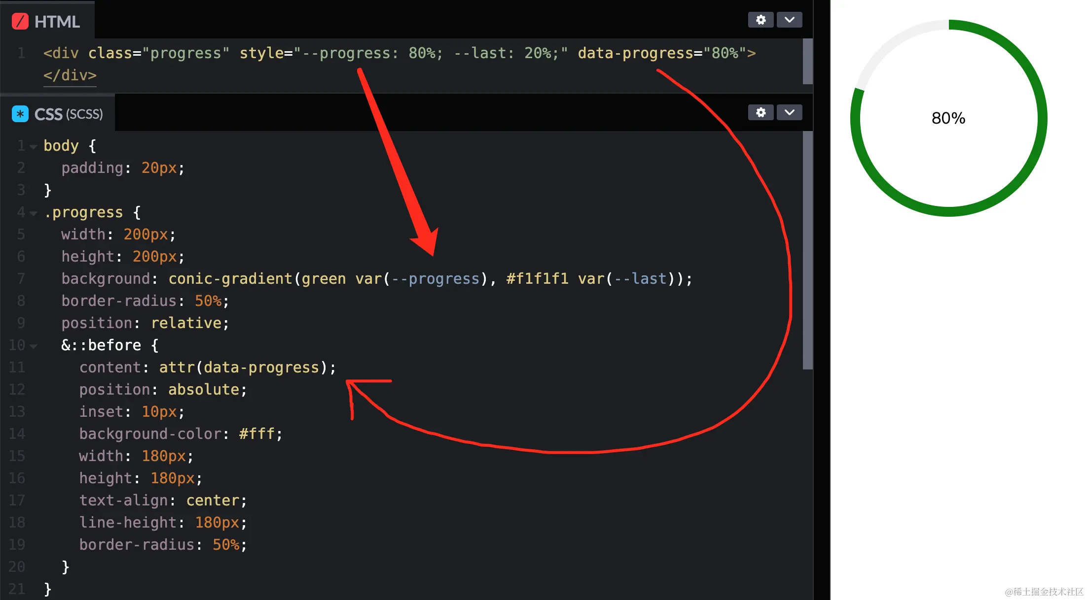<div class="progress" style="--progress: 80%; --last: 20%;" data-progress="80%"></div>