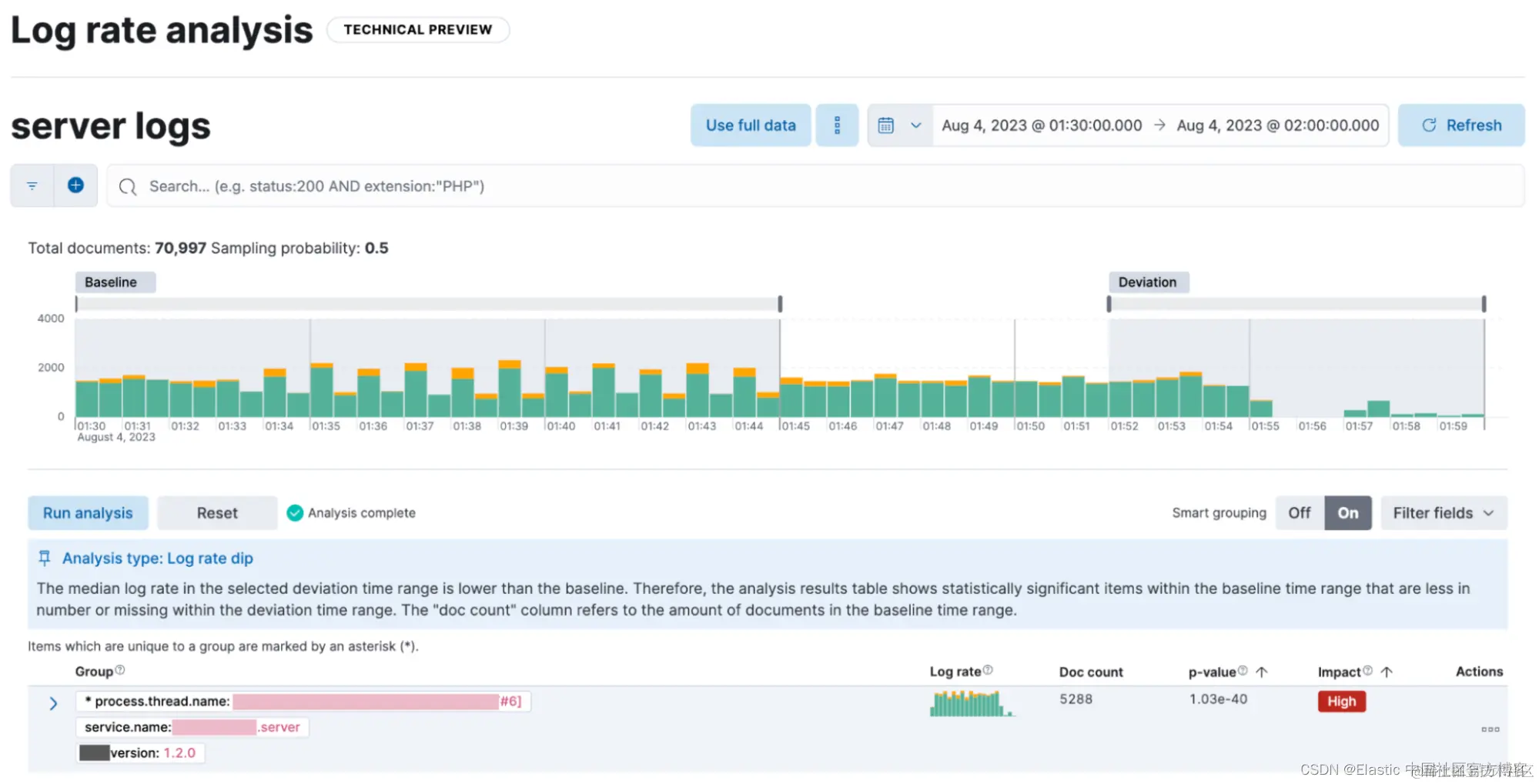 日志速率分析可帮助你通过识别字段值对来解释日志速率的下降和峰值,这些字段值对在选定的时间范围内与其基线发生情况相比显示出统计上显着的偏差(即下降时下降,峰值时上升)。 用户可以调整所选的基线和偏差时间范围,并且可以选择使用字段分组选项,该选项将倾向于同时出现的偏差字段显示在一起。 UI 提供了变化的极端程度(p 值)的衡量标准。 日志率分析可以帮助从简单地检测变化转变为关联事件并只需单击几下即可识别根本原因。 在 8.10 中,此功能处于技术预览版。