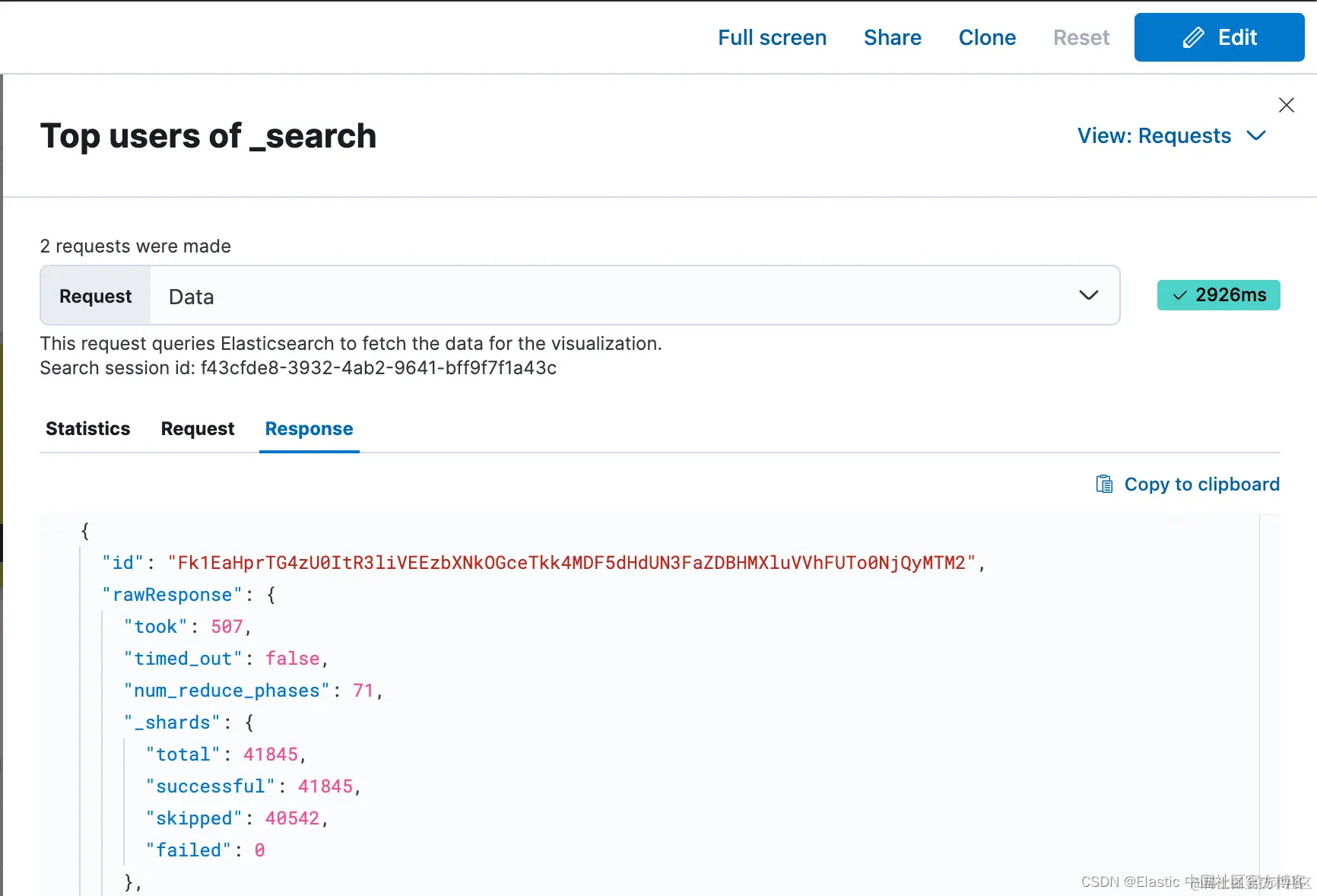要在 Kibana 中查看此额外信息,请使用检查功能查看:请求,然后单击响应选项卡: