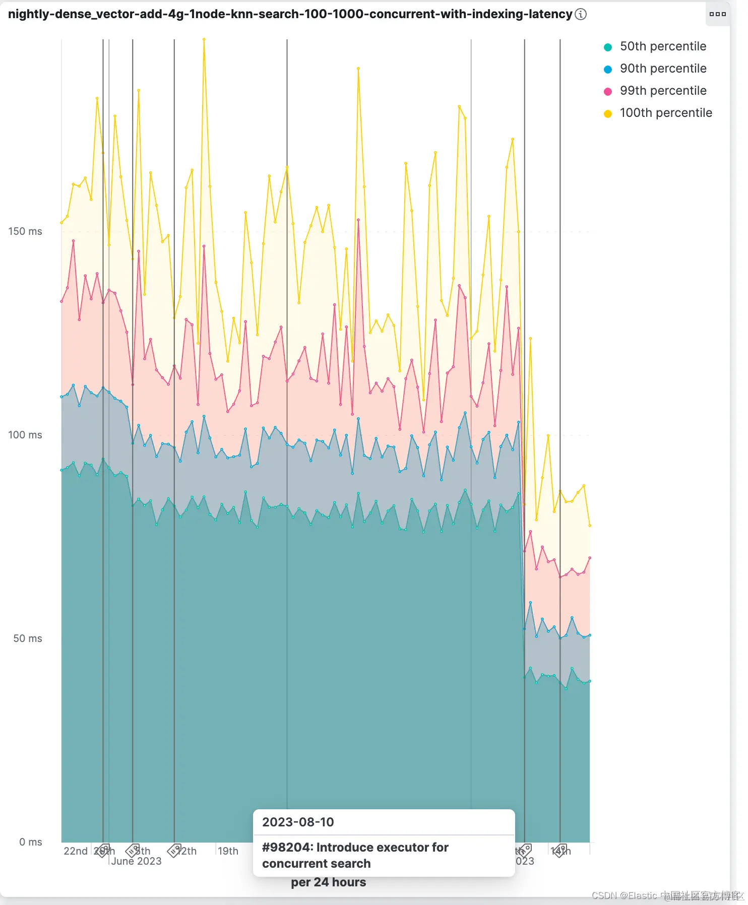 到目前为止,查询每个分片最多可以获得一个线程。 从 8.10 开始,如果线程池中有足够的可用线程,Elasticsearch 将在 kNN 向量搜索中为每个段分配最多一个线程。 当存在许多段和可用硬件时,这在基于 HNSW 的 kNN 向量搜索中尤其重要。 在我们的每天基准测试中,我们发现每个查询的查询延迟从 96 毫秒下降到 50 毫秒。