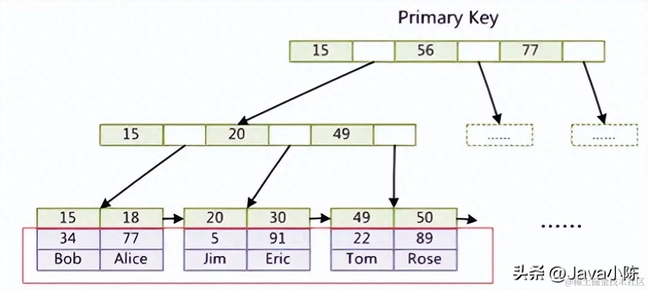- 树中的所有非叶子节点只存储键值(索引列)和指向子节点的指针。