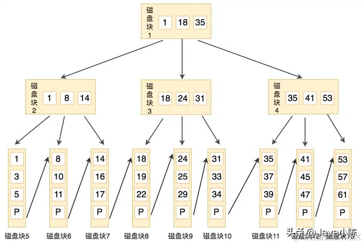 - 树中的所有叶子节点都位于同一层,并且通过指针相连。