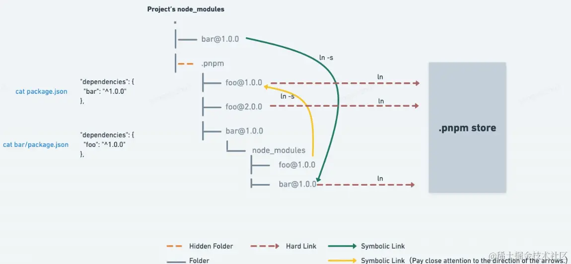 node_modules/.pnpm目录下,具体应该是node_modules/.pnpm/<name>@<version>/node_modules/name@<version>,然后硬链接到 .pnpm-store