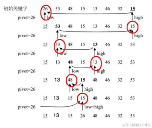 我们以关键字序列{26,53,48,15,13,48,32,15}看一下一次划分的过程: