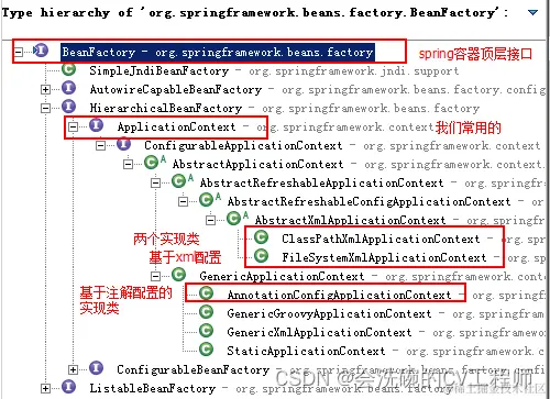 - ApplicationContext:ApplicationContext是BeanFactory的子接口。它除了继承 BeanFactory的所有功能外,还添加了对国际化、资源访问、事件传播等方面的良好支持。ApplicationContext有以下三个常用实现类: