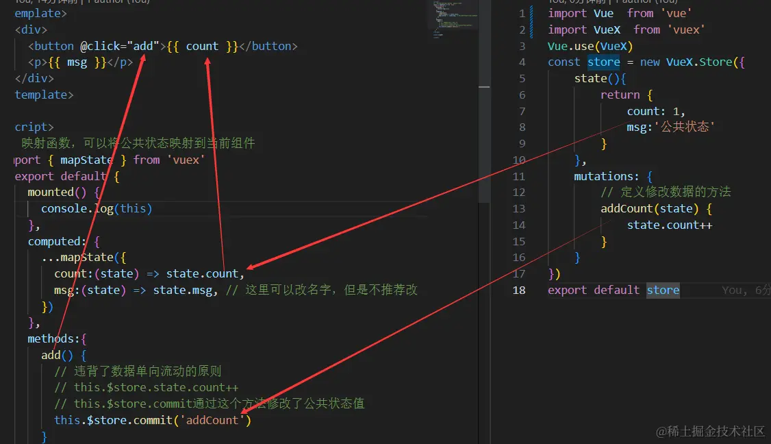 映射函数,可以将公共的状态映射到当前的组件,再在当前组件中调用就会简便很多。如果你使用的是Vue2版本的配置选项写法,使用映射函数往往非常高效。当一个组件需要获取多个状态的时候,将这些状态都声明为计算属性会有些重复和冗余。为了解决这个问题,我们可以使用 mapState 辅助函数帮助我们生成计算属性: