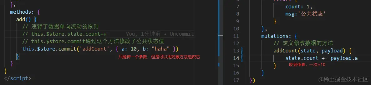 this.$store.commit('addCount', { a: 10, b: "haha" })