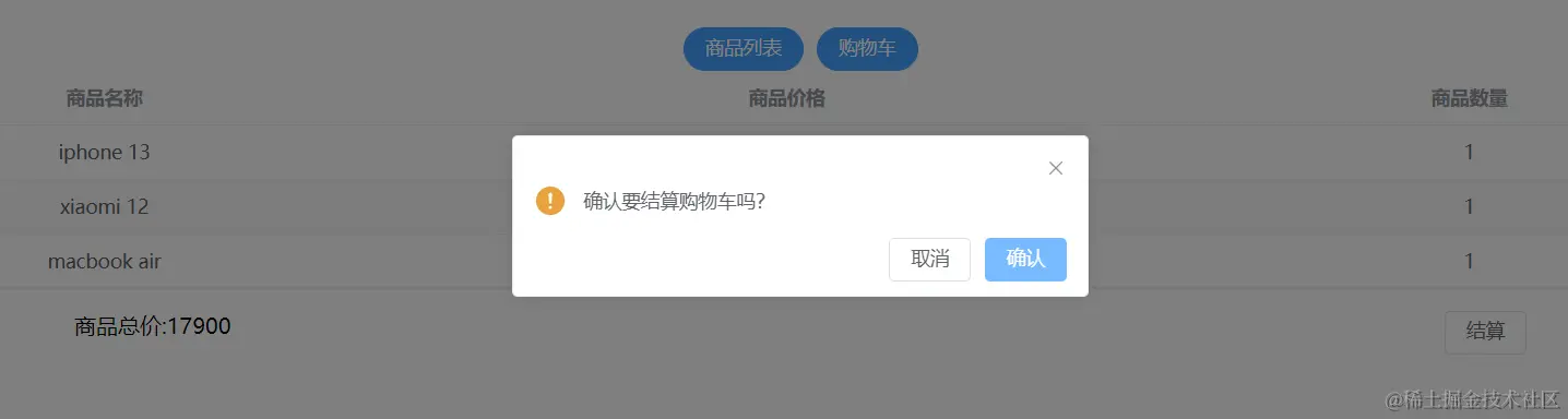然后优化一下 底部总价和结算按钮的布局,点击结算按钮时,给一个确认框的提示,这里可以用到Element-Plus中Message Box消息弹出框和刚才用过的Message 消息提示组件。
