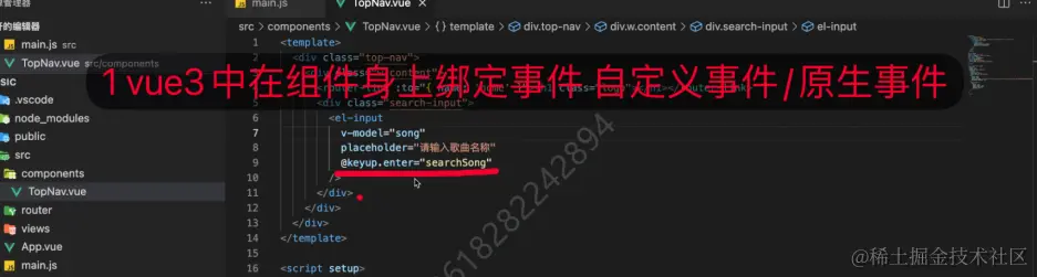 (2)vue3 中给组件绑定事件:vue3 对应组件会检视这个事件的名称,如果名称是一个原生事件,那么会将其作为一个原生事件处理,否则视为自定义事件