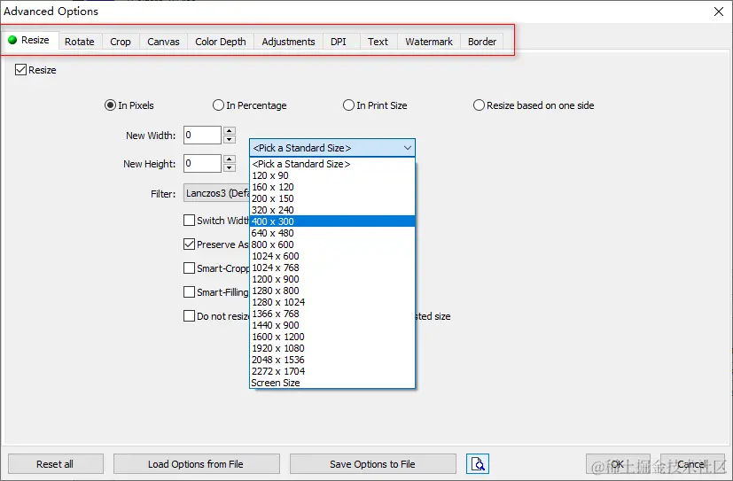 例如可以批量调整图片的大小尺寸,可按像素、百分比、打印尺寸、基于一侧调整等等。