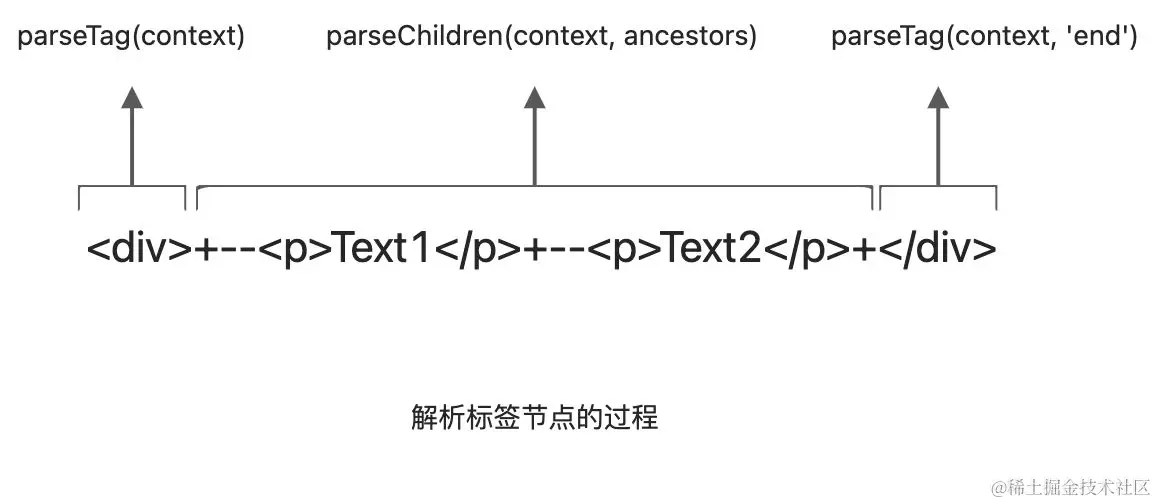 在调用 parseElement 函数解析标签节点时,会调用 parseTag 函数来解析开始标签和结束标签,对于开始标签和结束标签之间的内容,则递归调用 parseChildren 函数来解析子节点。