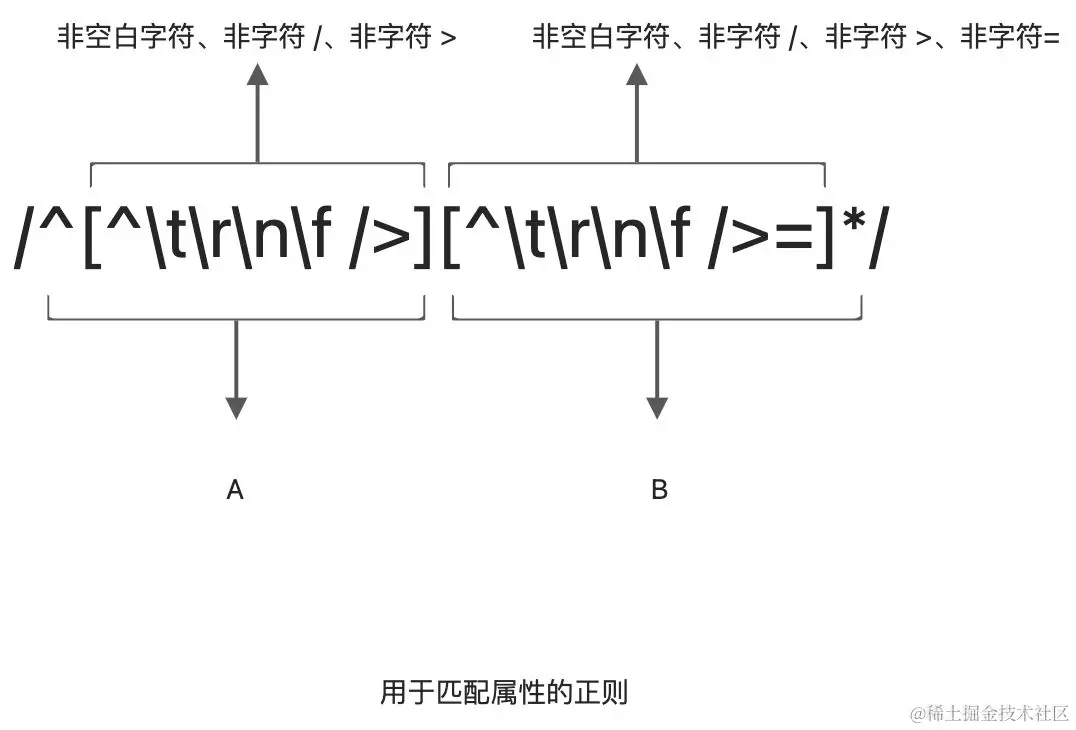 在调用 parseTag 解析标签时,除了将标签名称解析出来,还会调用 parseAttributes 函数来不断地解析标签上的属性、指令等。