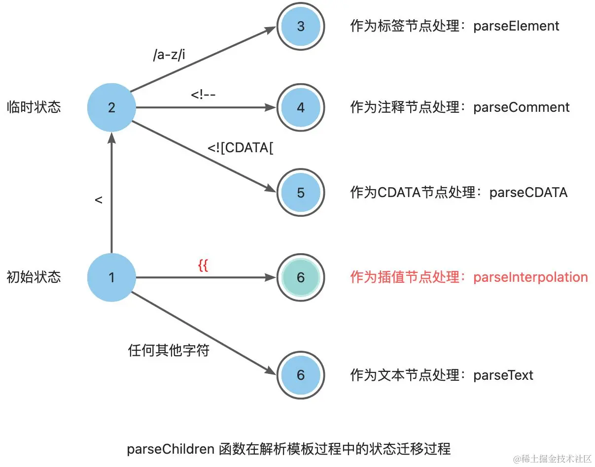 解析器在遇到文本插值的起始定界符 {{ 时,会进入 “插值状态6”,并调用 parseInterpolation 函数来解析插值内容,如下图所示: