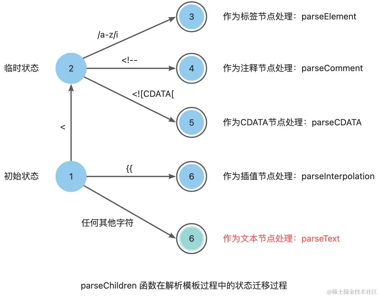 模板在《Vue3 源码解读之模板AST 解析器(一) 》一文中,我们介绍了解析器的实现原理与状态机有关,并介绍了解析器的核心处理函数 parseChildren 的解析过程。在本文中,我们将详细介绍解析器解析过程中是如何完成不同节点的解析。