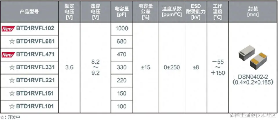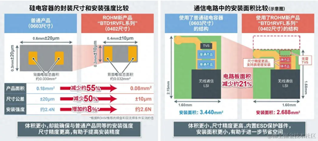 第一波产品“BTD1RVFL系列”的尺寸仅为0402(0.4mm×0.2mm),是业界超小尺寸的表面贴装型量产硅电容器。与0603尺寸的普通产品相比,其安装面积减小约55%,仅为0.08mm2,非常有助于应用产品的小型化。另外,新产品还内置TVS保护器件,可确保出色的ESD* 2 耐受能力,减少浪涌对策等电路设计工时。