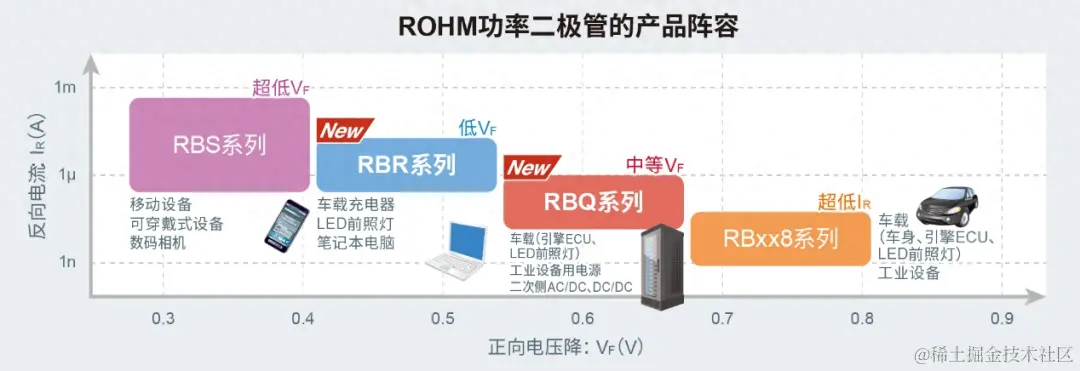 RBR系列不仅保持了与低VF特性存在权衡关系的低IR特性,与相同尺寸的ROHM以往产品相比,VF降低约25%,损耗更低,不仅非常适用于要求更高效率的车载充电器等车载设备,还非常适用于要求更节能的笔记本电脑等消费电子设备。