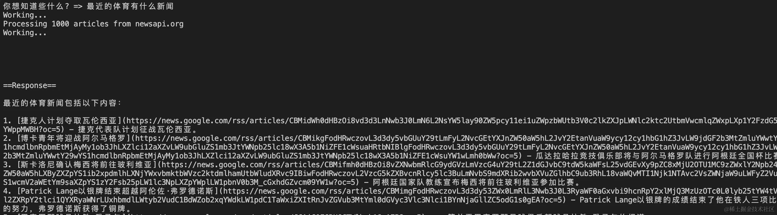 print("你可以这样问我:n - 告诉我最近有什么技术发现?n - 最近的体育有什么新闻n - 知识星球最近有什么精彩内容n")