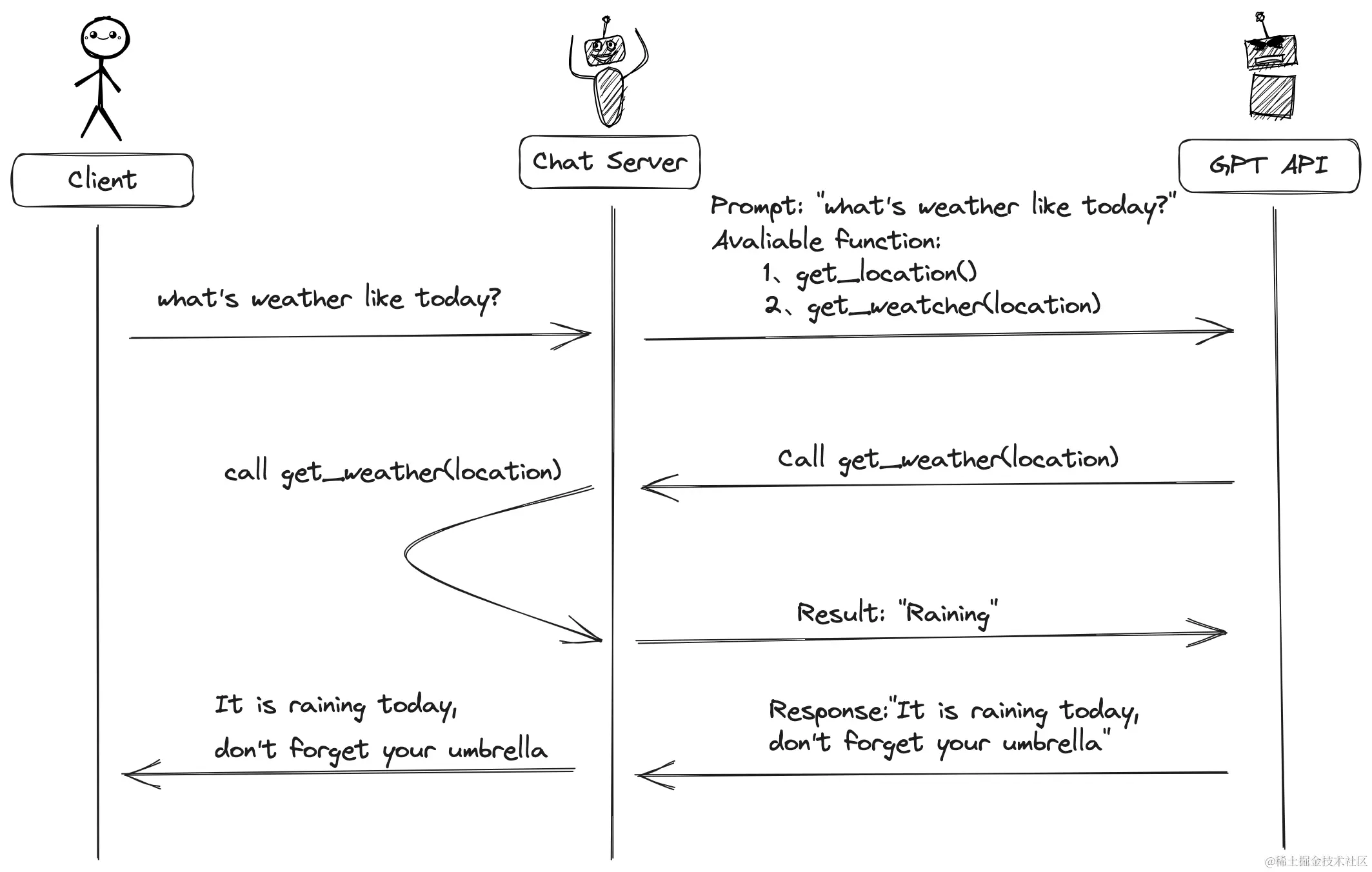 get_current_weather将会使用返回的参数调用。OpenAI不执行该函数,我们的服务会执行这个函数,并且获取结果后解析返回给OpenAI。