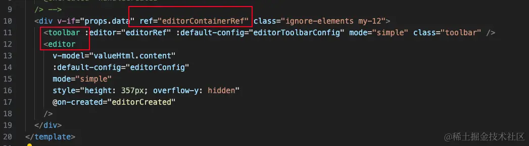 最后,将useEditor hook返回的结果解构赋值给之前定义的变量,以获取相关引用和配置信息, 代码: