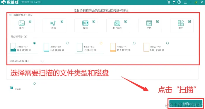 1.在软件中,先点击【免费扫描】,然后可以对需要扫描的文件类型进行选择,选择时为了更全面扫描到磁盘数据,建议选择所有文件类型,然后勾选上需要扫描的磁盘,单击 【扫描】 ;