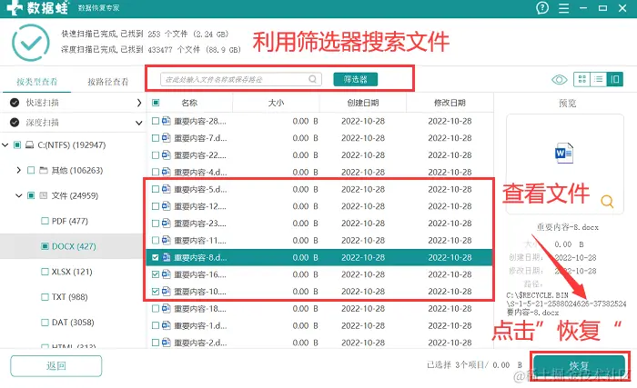 3.深度扫描是软件的第二次扫描,在此次扫描中,软件会对磁盘进行全面的扫描,此时建议耐心等待扫描结果出现后再进行选择,当所有选择完成后,点击 【恢复】 并选择合适的保存位置。