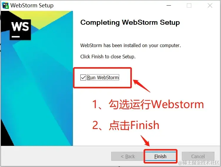 5.安装完成后,勾选 Run IntelliJ Webstorm,点击 Finish 运行软件: