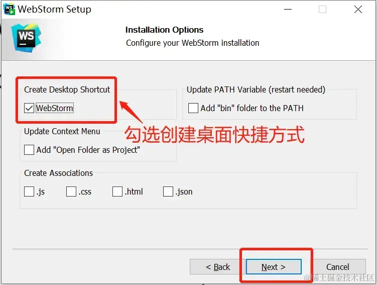 3.勾选创建桌面快捷方式,这边方便后续打开 Webstorm: