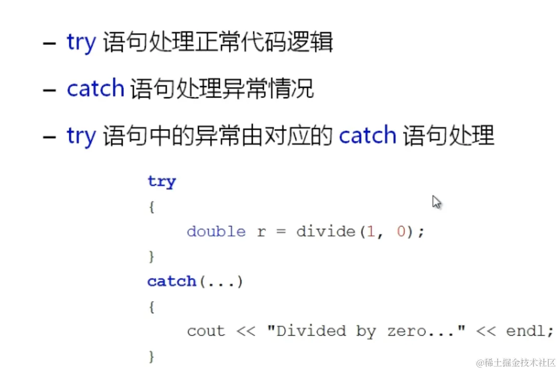 这条语句声明了一个名为 func 的函数,它的返回值类型为 double,有一个 char 类型的参数,并且只能抛出 int 类型的异常。如果抛出其他类型的异常,try 将无法捕获,只能终止程序。如果函数会抛出多种类型的异常,那么可以用逗号隔开: