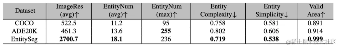 最后,为了让EntitySeg数据集更好地服务于学术界,11580张图片在标注实体掩膜之后,以开放标签的形式共标注了643个类别。EntitySeg、COCO以及ADE20K数据集的统计特性对比如下: