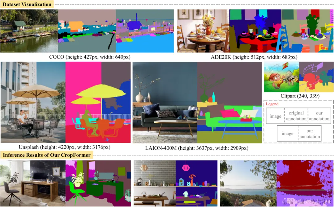 - 图片分辨率更高,标注更精细。如上图所示,即使相比COCO和ADE20K数据集的原始低分辨率图片及其标注,EntitySeg的实体标注更全且更精细。