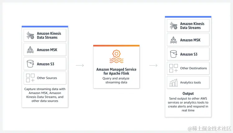 AWS 托管的Apache Flink 服务,支持Flink SQL 和 jar 方式提交任务,通过IAM 赋权,可以处理AWS 基础数据服务如:MSK,S3,Kinesis Data Streams 等。 收费模式是按消耗的KPU(1vCPU 4GB)的量来计费。