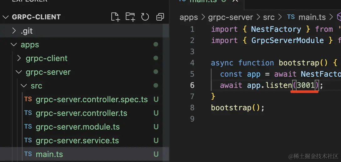 这里使用 createMicroservice 创建微服务,指定传输方式 transport 改为 GRPC,并且指定微服务监听端口为 8888。