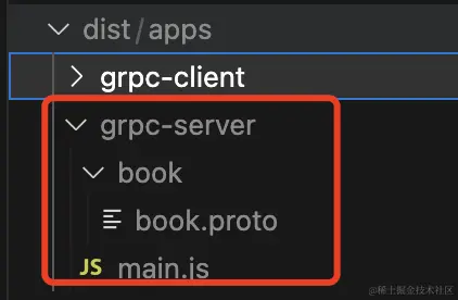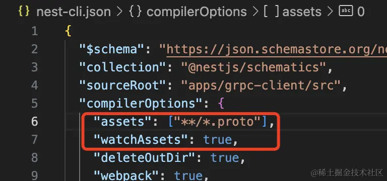 在 nest-cli.json 添加 assets 配置,让 nest 在 build 的时候把 proto 也复制到 dist 目录下: