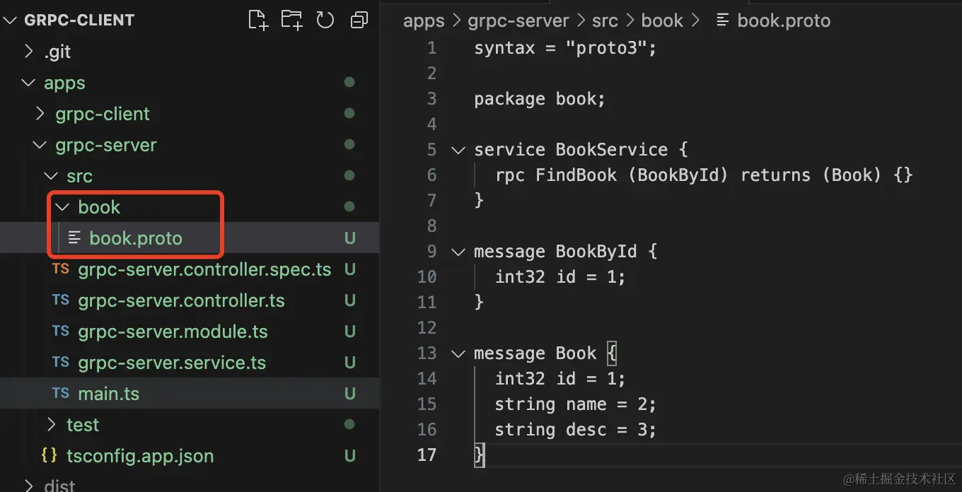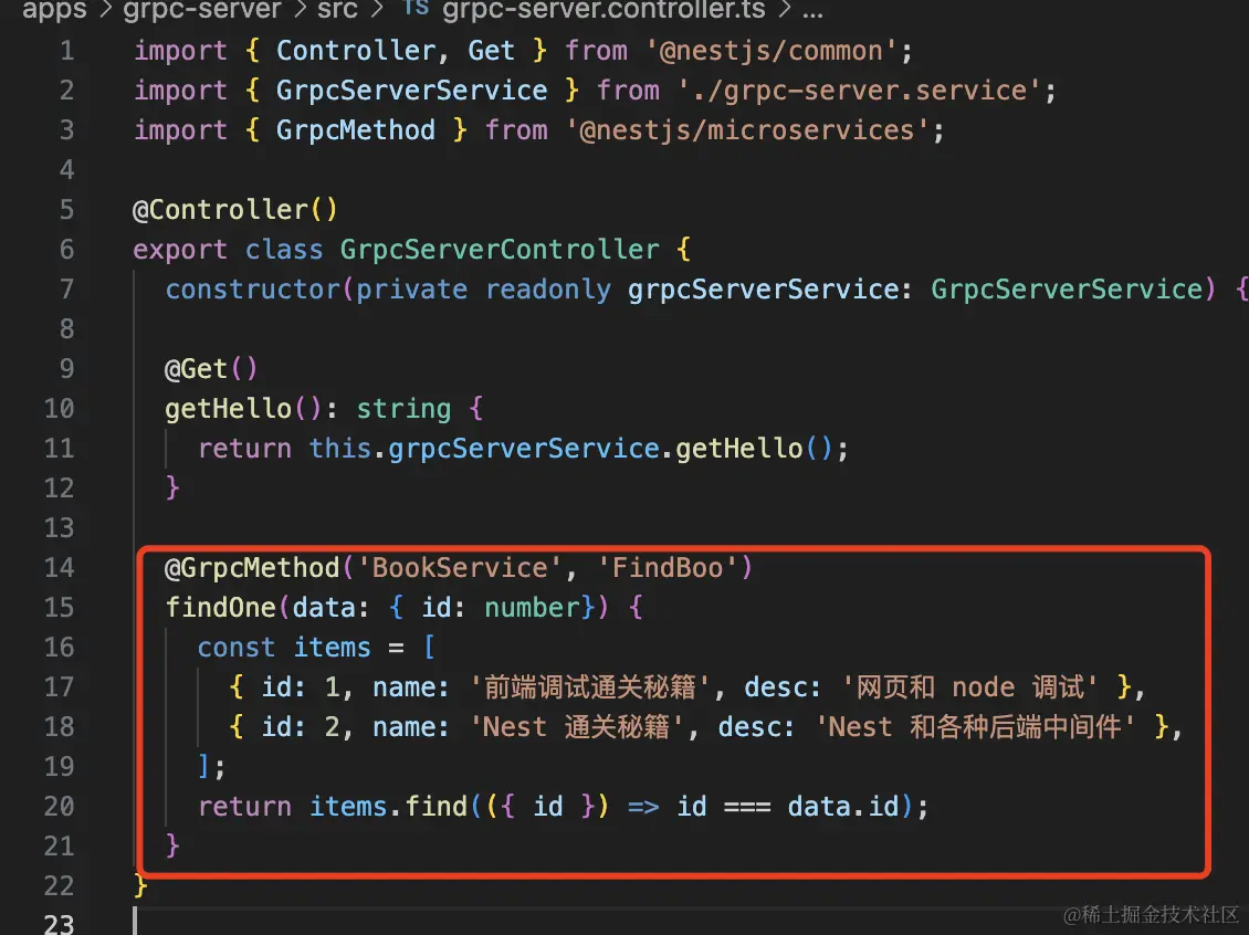 实现了 findBook 方法,并通过 @GrpcMethod 把它标识为 grpc 的远程调用的方法。