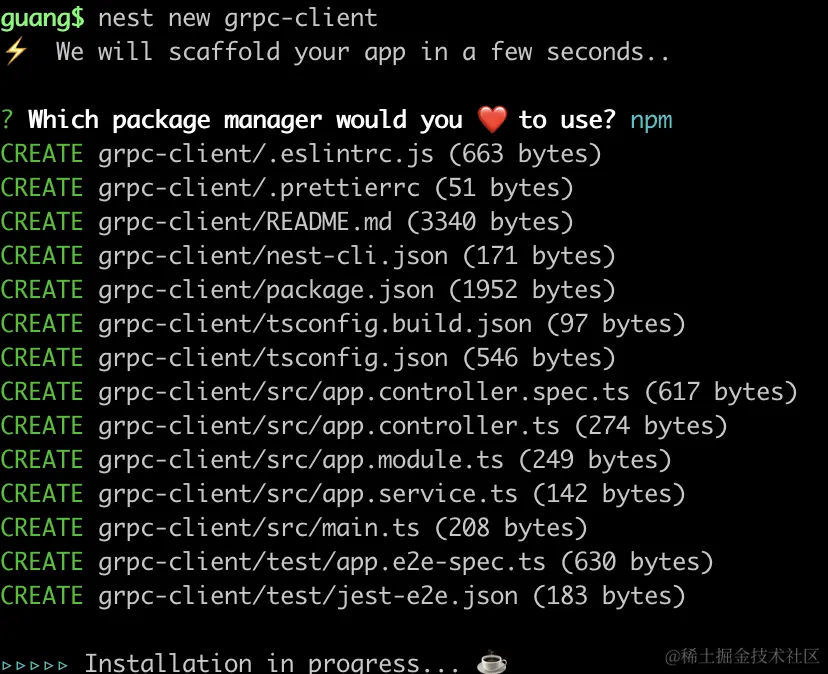 当然,我们不会真的创建 java 的微服务,而是会用两个 nest 的微服务之间实现 gRPC 通信。