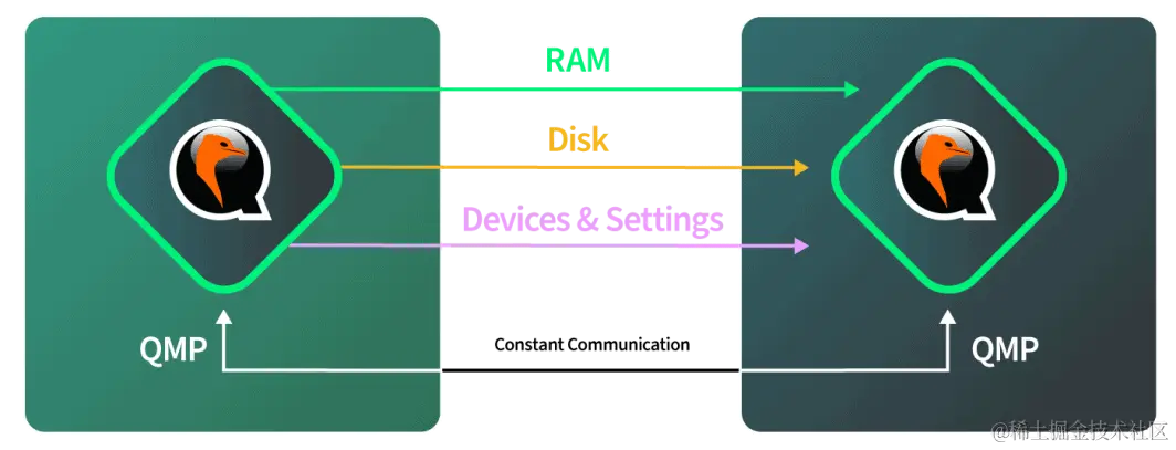 - 对内存数据进行实时迁移。迁移过程中, 内存内容的任何变化也会提交至目标内存。如果这一过程中磁盘内容也出现了变化,相关变化同样会被提交至目标QEUM实例的磁盘中。