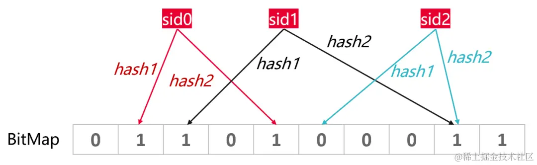 布隆过滤器: 一个很长的二进制向量和一系列随机映射函数,当所有的hash函数指向的bit位均为1时,表示目标数据存在,反之不存在。