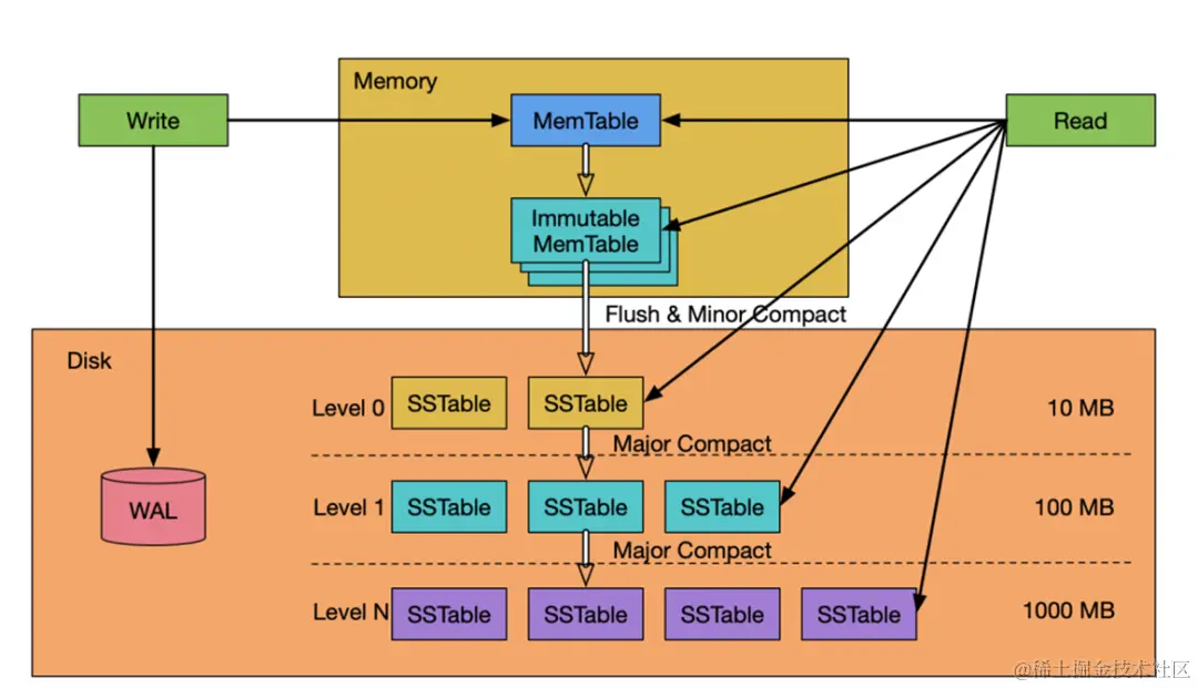 为了提升IO性能,我们需要一种能将随机操作变为顺序操作的机制,于是便有了 LSM 树。LSM 把大量写入缓存在内存,当积攒到一定程度后,将他们批量写入文件中,这要一次 I/O 可以进行多条数据的写入,从而大幅提升写操作,作为代价的是牺牲了一些读性能。