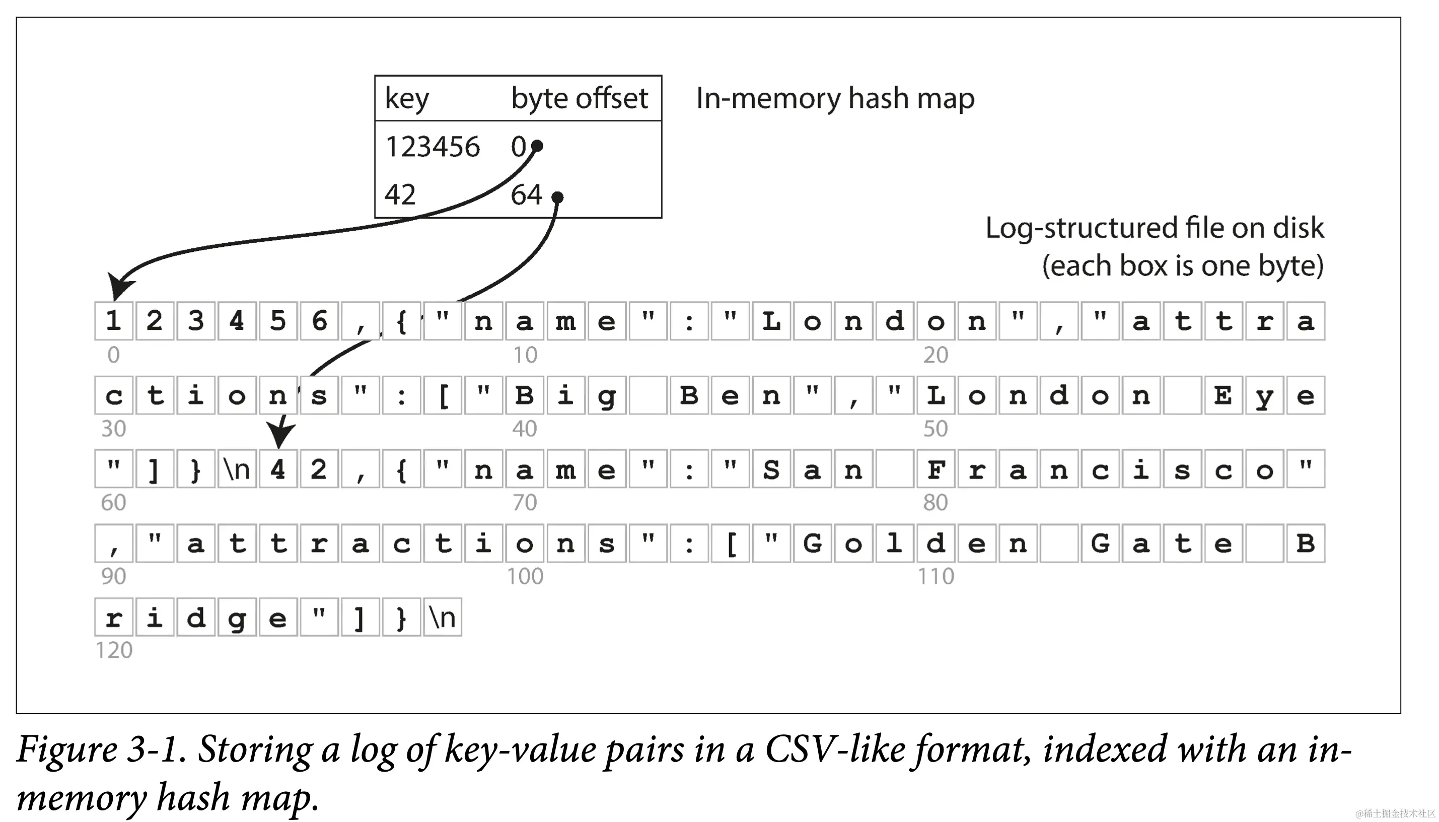 我们仍然让所有数据顺序追加到文件上。为了加快查询,我们在内存中构建一个哈希索引: