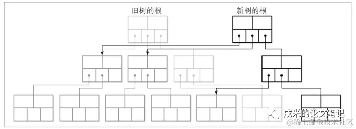 对页的每次修改,都复制一个新页,所以父页中存储的指针也要修改,父页也复制一遍,级联复制到根节点。