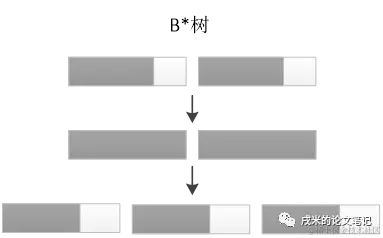 B*树:节点满时,先将部分数据搬迁到下一个兄弟节点,两个节点都满了,再由两个节点分裂成2个。最低空间利用率2/3