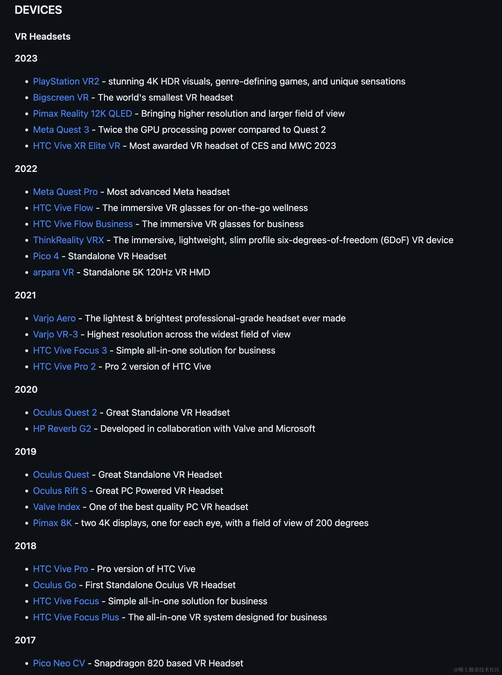 如果你对各种 XR 设备还不了解,DEVICES 这一部分,也有助于你对 XR 世界的各种设备以及其对应出现的时间点有一个大致的概念。