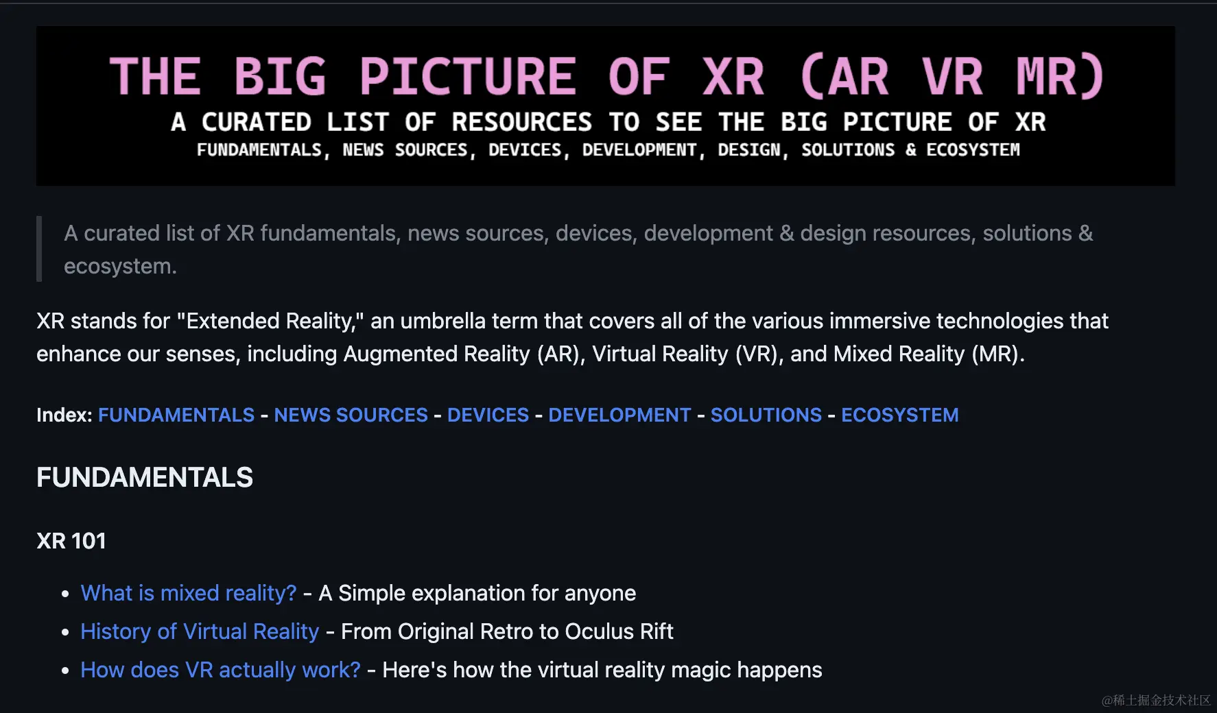 在这份列表中,首先会有几个关于 XR 的入门解释文章,如果你对 XR 还一无所知,可以先通过这些文章来扫扫盲。