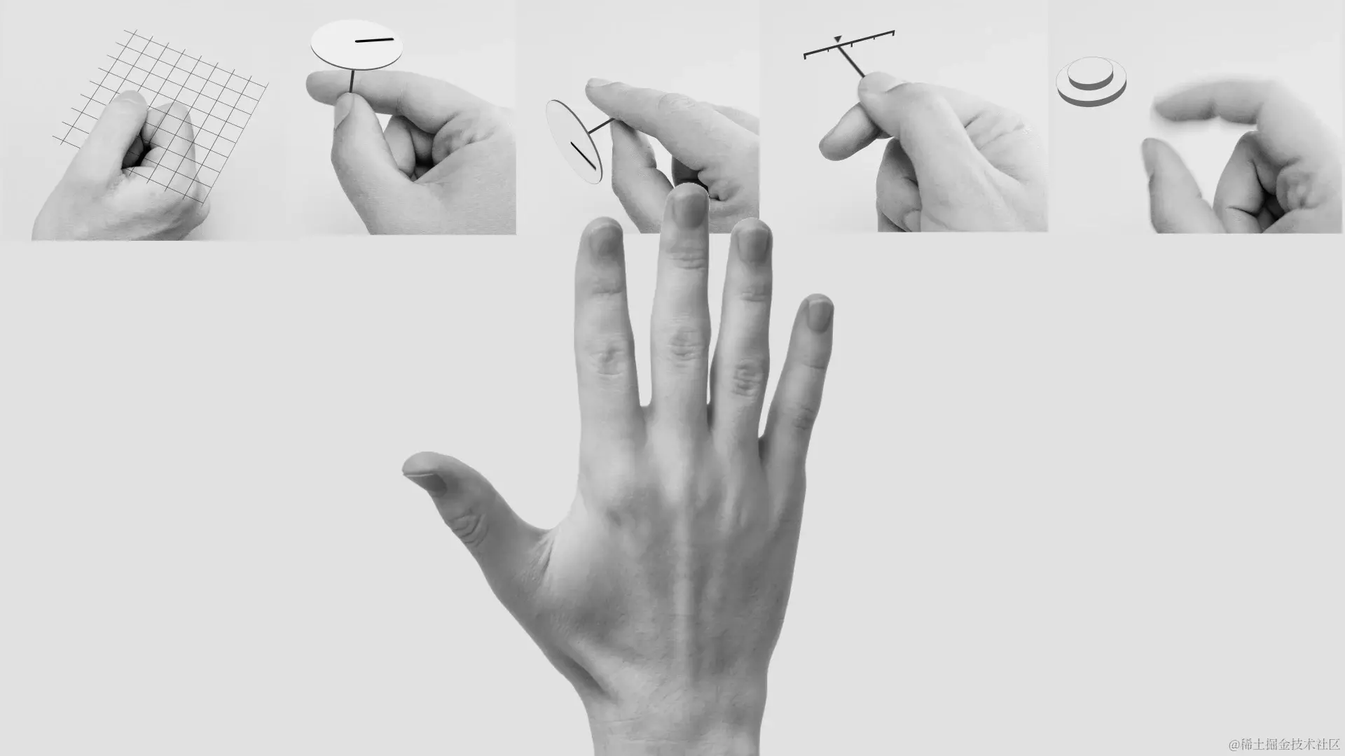 如果我们暂时不考虑上述算法能力的制约,一些复杂的手势能否由单手完成?以及能否有一些其他手势交互的设想?ATAP 的小伙伴们在 Soli 项目中探索了一些有趣的手势交互设计,包括转动滚轮,移动坐标,当然,也包括我们熟悉的点击按钮设计(一位 X 上的网友通过 下图 的手,表达了一个观点:手是我们唯一需要的交互媒介)。