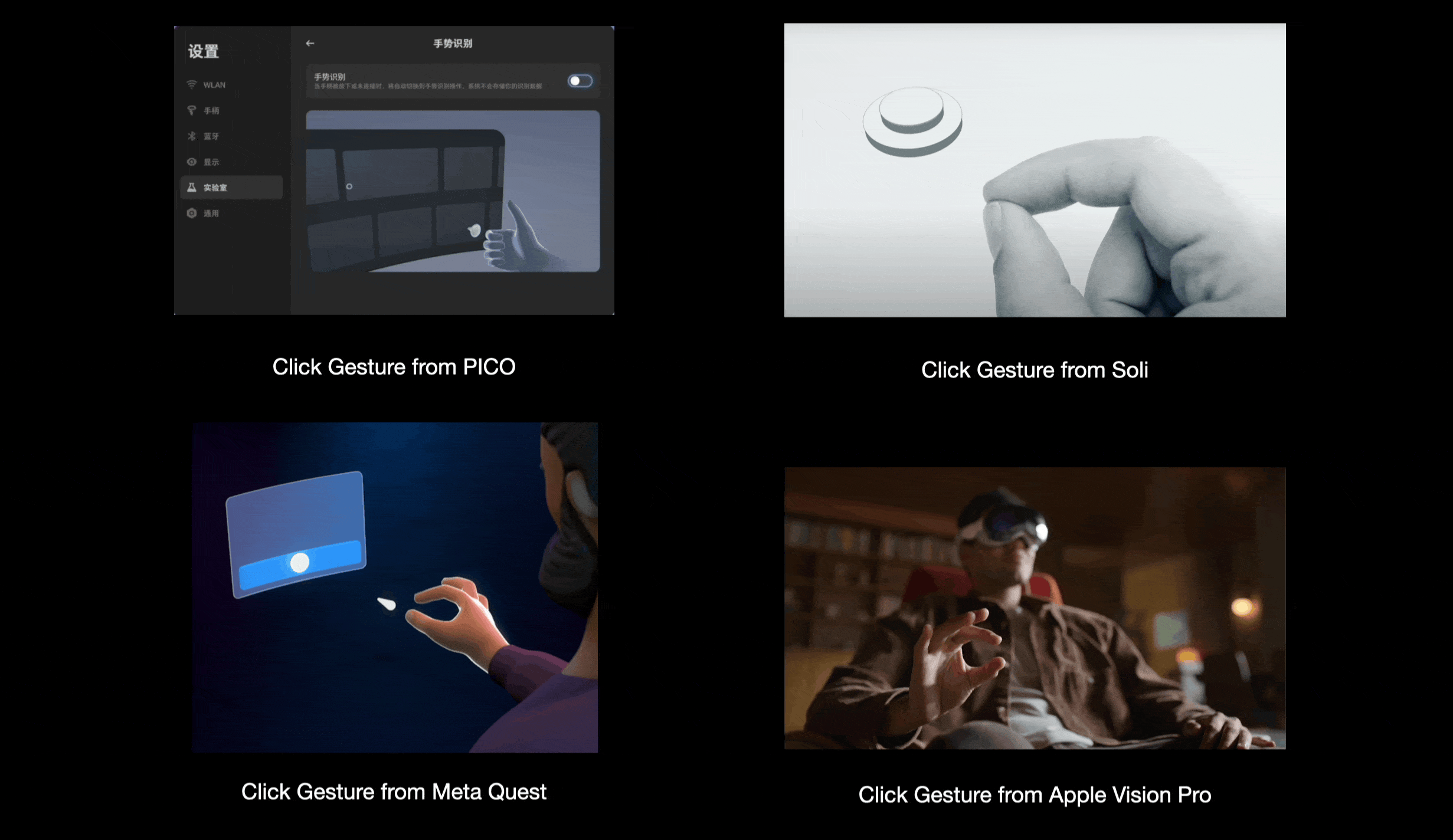 当然,除了从算法出发设计更容易识别的手势,或者从人本出发,设计更符合直觉的手势,我们也需要从文化差异来设计手势,比如现在我们在 Meta,Apple Vision Pro 以及上面提到的 Soli 项目中的点击确认按钮都是使用大拇指和食指捏合来实现的,但是考虑到一些不同地区的文化差异,也可以选择类似 PICO 中的大拇指点击食指指肚来实现。