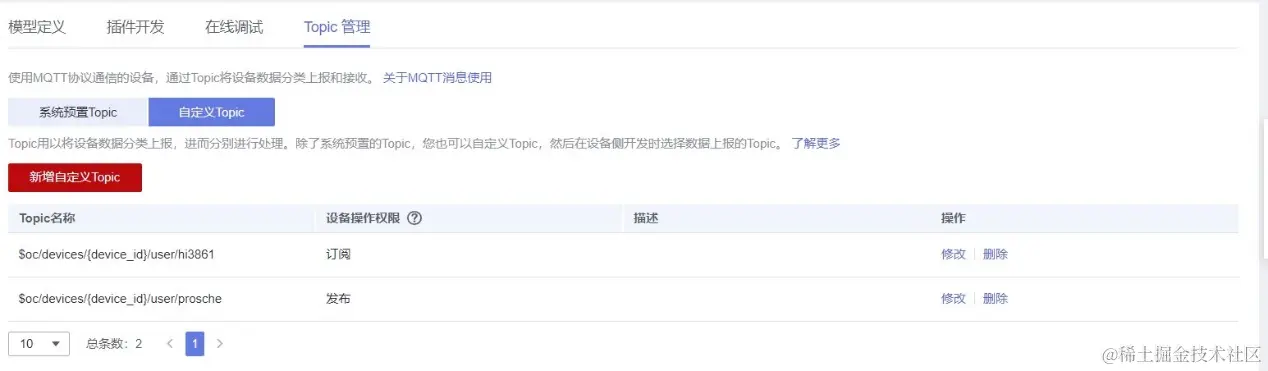 ② **华为云:**根据提示创建并获取密钥等信息,获取ClientID等身份识别信息,然后在云端的Topic(事件主题)中自定义订阅与发布,对产品进行定义。