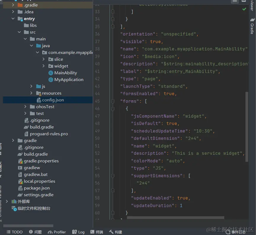 (vi)开发环节:创建完之后然后就可以看到在原有的subject中生成了config.json文件。js默认配置了卡片大小等信息,froms下的是ability中生命周期管理的核心部分(用于回调),会在主函数中实现调用。